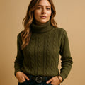 This cable knit jumper from Amouvelle combines warmth and elegance in a timeless winter design. The soft ribbed texture and fitted silhouette create a refined balance between comfort and sophistication. The high turtleneck offers a sculptural line that frames the face beautifully while providing cosy protection against the cold.