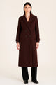 Straight longline silhouette with structured shoulders and double-breasted closure.