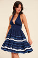 Playful and flattering, this halterneck mini dress captures the essence of summer elegance. Its plunging neckline and fitted waist contrast beautifully with a full, flared skirt detailed in blue and white stripes. Crafted from a soft cotton blend with light stretch, it offers both structure and comfort for warm days and festive evenings.