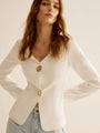 This Amouvelle fitted blazer embodies understated sophistication. The clean V-neckline and sculpted waist create a refined, feminine shape that flatters the form. Gold buttons add a subtle statement to its minimalist tailoring, balancing polish with modern ease.