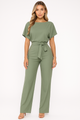 A clean one-piece with a fluid wide leg and a softly structured waist. The boat neckline and short sleeves keep the profile refined, while the self-tie belt defines shape without fuss.