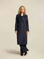 A refined interpretation of a wardrobe essential, this long coat is crafted from a premium wool blend for warmth and durability. Its double-breasted closure and structured lapels evoke timeless sophistication, while the deep navy tone ensures effortless versatility across occasions.